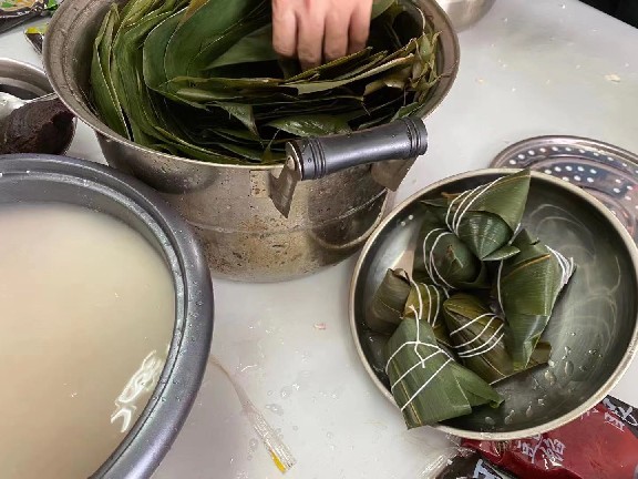 2021年6月11日早晨,许多员工就开始忙碌起来,从家里带来电磁炉、煮锅等炊具;事前泡好相应数量的糯米、准备好馅的配料及包扎的柴绳、粽叶,比赛结束后帮助煮熟粽子。